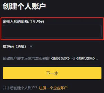 2、币安已全面开放大陆用户进行手机号注册,输入邮箱/手机号、点击下一步即可