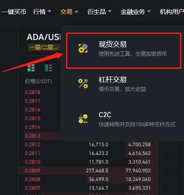 6、点击上方导航栏的【交易】【现货交易】