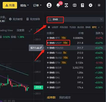 7、搜索币种简称【BNB】,选择【BNB/USDT】交易对