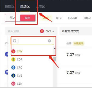 10、点击【自选区】,选择【卖出】,选择【CNY】,BNB币提现人民币步骤就可完成