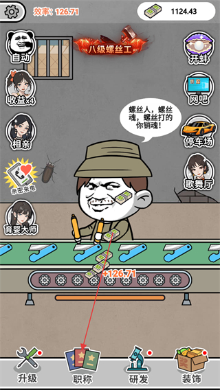 从赚取基础工资开始,逐步解锁更好的工具,提升打螺丝效率,积累财富实现从工人到富裕的成长。