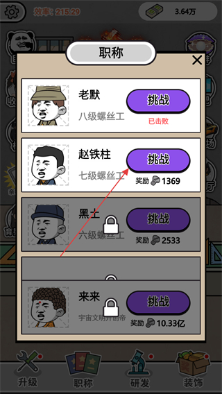 1、点击职称,查看可挑战的螺丝工职称,如八级老默、七级赵铁柱等。