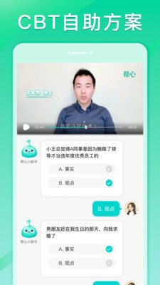 《帮心心理》提供了很好的在线咨询心理问题的平台,在这里用户的个人隐私会得到很好的保护,所以用户可以放心在这进行咨询,系统会根据你的心理问题提供详细的建议,提供最专业的CBT心理咨询,可以通过对认知和行为的干预,达到改善心理困扰的效果,方便你做参考。