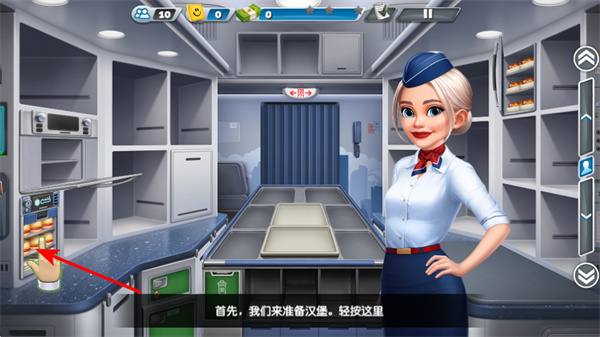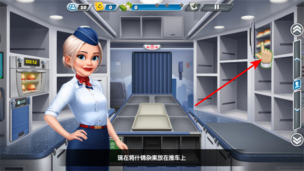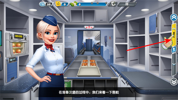 3、在准备餐食过程中,点击右侧操作按钮切换场景,这是了解客舱布局的核心步骤,切换后可熟悉客舱环境,为后续服务做准备。