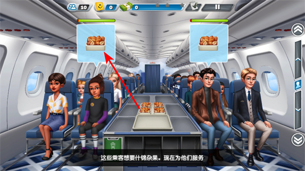 4、进入客舱服务环节,根据乘客需求点击对应餐食区域,这是完成服务任务的关键操作,需准确识别乘客需求并及时送达餐食。