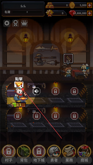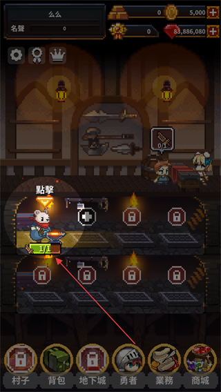 1、点击勇者进行點擊操作,升级勇者形象与等级。