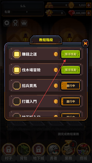 4、在教程阶段点击獲得獎勵,领取教程奖励,推进游戏进程。