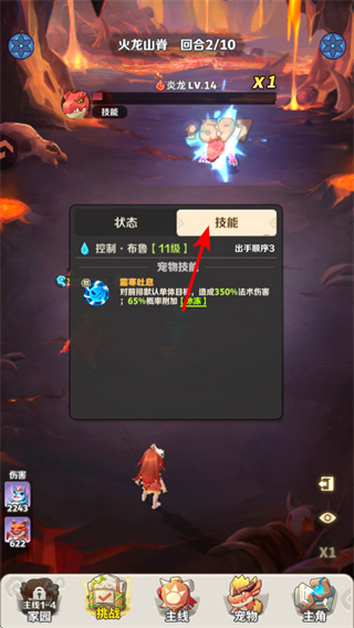 3、战斗中查看宠物布鲁的复制绽放技能界面,这是制定战斗策略的关键操作,需牢记其高伤害与控制效果,在对抗火龙类敌人时优先释放。