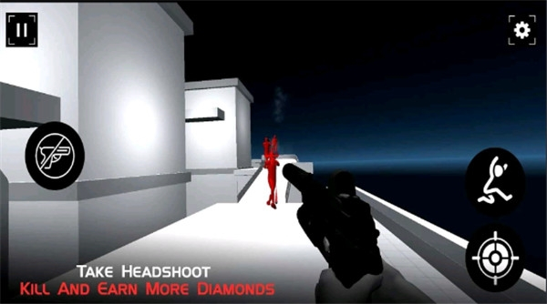 4、点击瞄准按钮,精准射击远处红色敌人,消灭目标推进游戏。