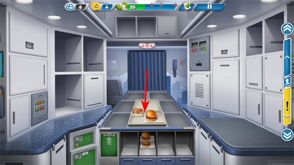 1、进入厨房界面后,点击餐食放置区域,这是配置推车餐食的关键操作,需将汉堡等餐食准确放置到推车对应位置,为客舱服务备足资源。