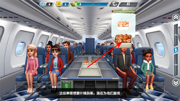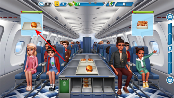 2、在客舱服务场景中,识别乘客汉堡需求标识,点击对应服务区域,这是完成餐食送达的核心操作,需快速响应需求,确保餐食准确送达乘客。