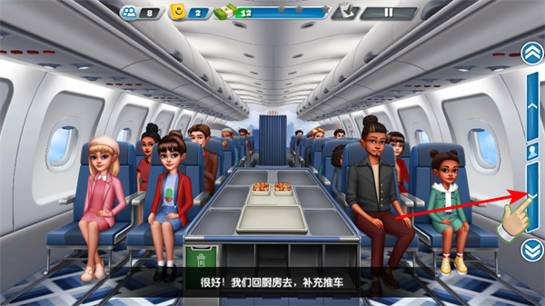 3、需要切换场景时,点击厨房右侧返回按钮,这是往返厨房与客舱的关键步骤,点击后可快速回到客舱或进入厨房,衔接餐食准备与服务流程。