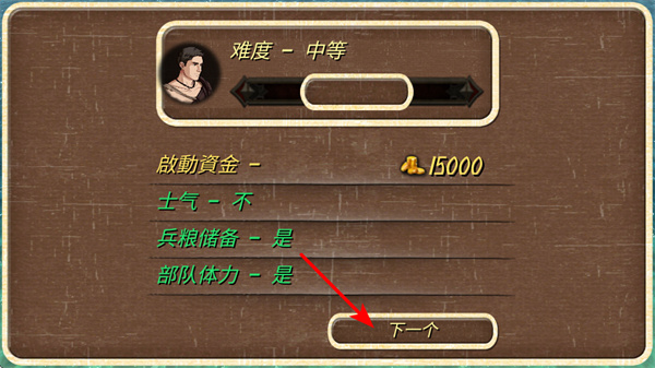 1、进入游戏难度设置界面后,点击下一个按钮,这是推进开局配置的关键操作,点击后可确认难度、启动资金等设置,开启游戏进程。