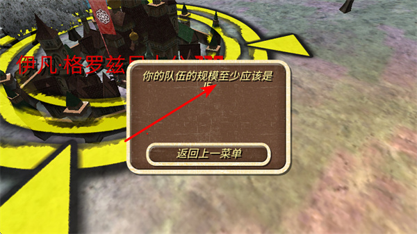 3、若出现队伍规模至少10的提示,点击返回上一菜单按钮,这是调整队伍配置的关键步骤,需招募士兵扩充队伍,满足后续操作条件。
