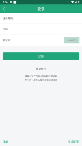 考生进入登录页面,输入注册时使用的证件号码、密码及验证码,点击登录按钮,登录网上报名系统。