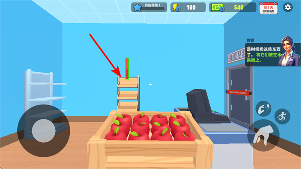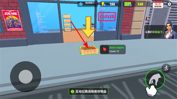 2、在超市场景中,互动挑选库存物品如苹果箱,这是开展经营的核心操作,挑选后可将物品上架销售,推进超市运营进程。