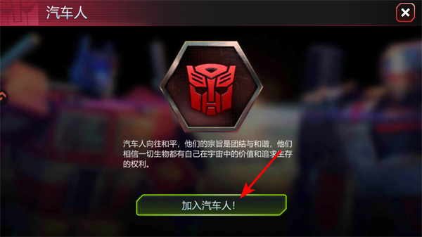 2、在汽车人阵营介绍界面,点击加入汽车人按钮,这是正式加入阵营的核心操作,点击后可进入汽车人阵营的游戏进程。