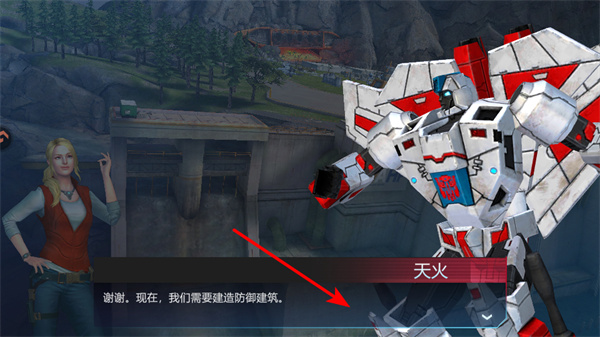 3、根据剧情提示,与天火等汽车人角色互动,这是推进剧情的关键步骤,互动后可获取建造防御建筑的任务,开启基地建设玩法。