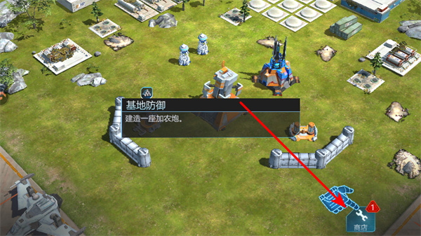 4、在基地建设界面,点击商店按钮,这是获取建筑资源与防御设施的基础操作,进入商店后可购买加农炮等防御建筑,提升能力。