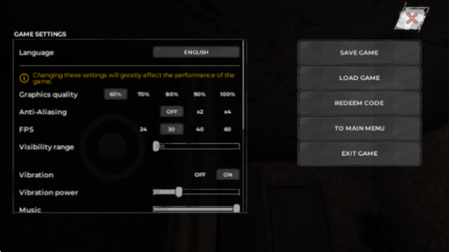 7.若需调整游戏参数,进入“GAME SETTINGS”界面,可对语言、画面质量、抗锯齿、帧率、可视范围、振动、音乐等进行设置;右侧还有保存游戏、加载游戏、兑换代码、返回主菜单、退出游戏等功能选项。