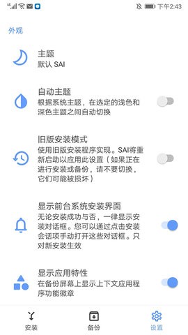 2、进入主界面:打开 SAI 安装器,主界面包括 “安装”“备份” 和 “设置” 栏目。