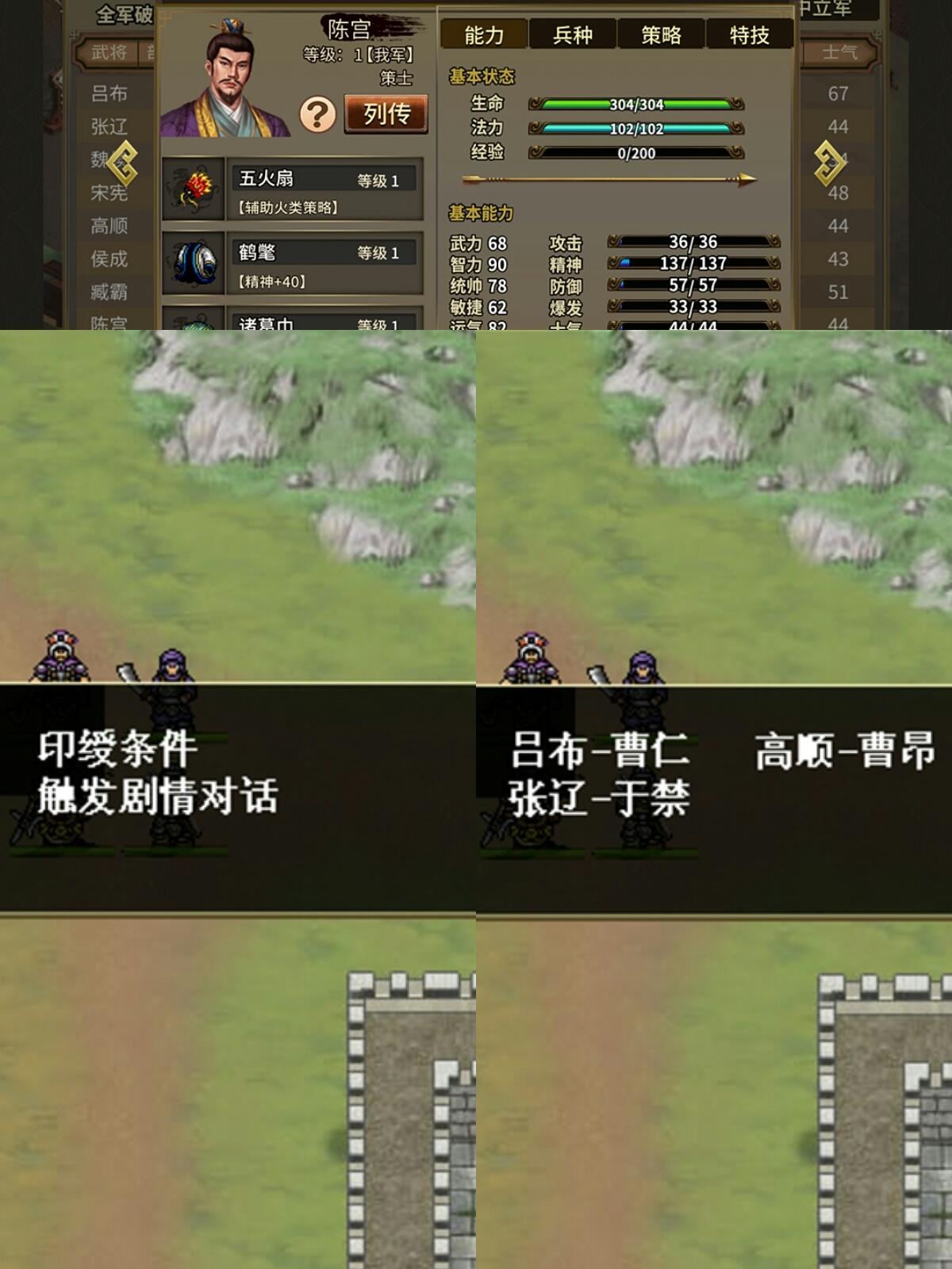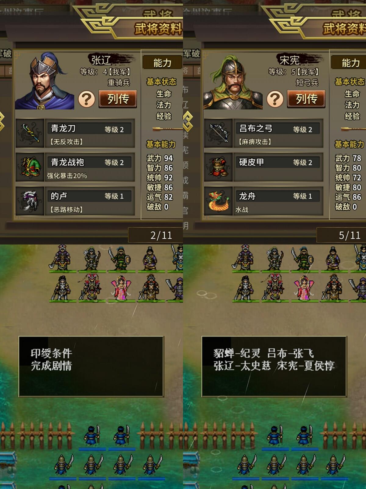思路:杀敌靠友军和吕布,张辽、貂蝉、宋宪负责触发剧情,其余人员原地待命即可。