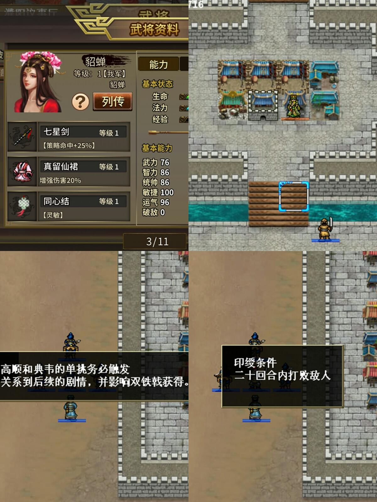 2、开局吕布单挑李典后加攻击爆击,山下的骑兵部队减防御,第十四回合左边小城上面会出现骑兵援军(我一般最多8回合就结束了看不到他们)貂蝉对话吕布全军加攻击