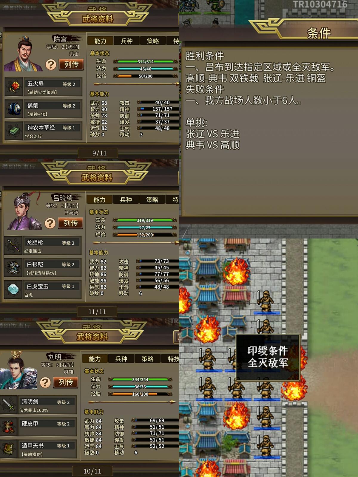 备注:视频只是我自己的打法仅供参考,上面所述的除吕布的装备外,其他人的没有也没关系不影响,因为我们的总体思路主要靠吕布和沮受二人,多周目还需培养张辽和魏续辅助通关