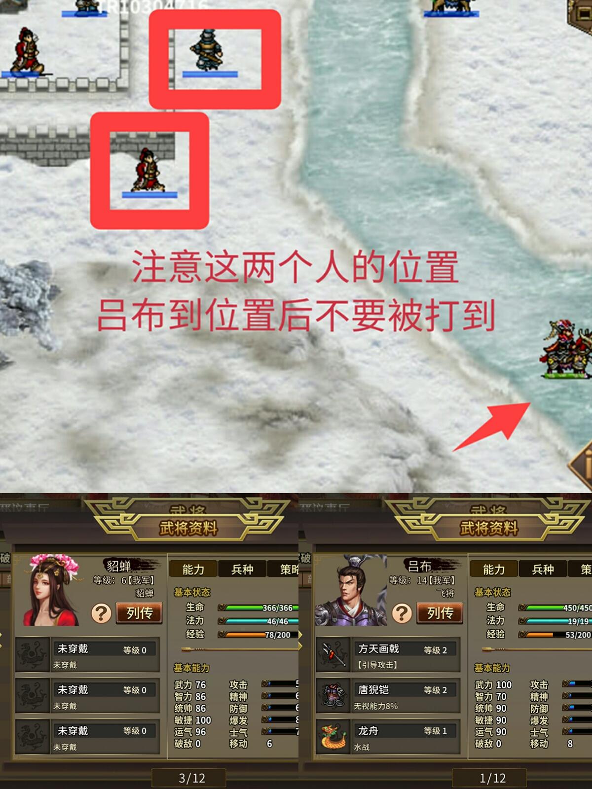 思路:两个思路:思路1,只出战吕布和貂蝉(貂蝉卸掉所有装备),让吕布装备龙舟站到(27.25)河里,全程挂机20回合即可过关,省时省力,还可以压级(推荐);思路2,全灭敌军,全员龟缩内城,堵住四个门,吕布单人随意出去冲杀,依靠内城四个炮车可尽快全灭敌军。