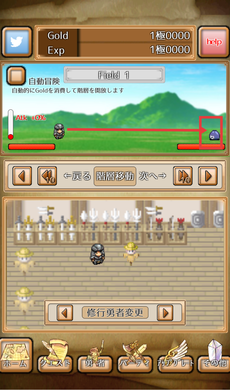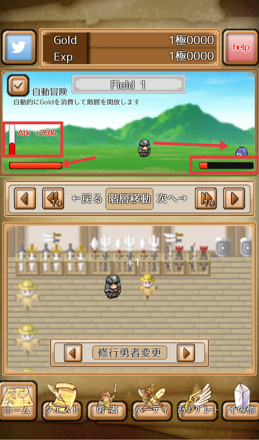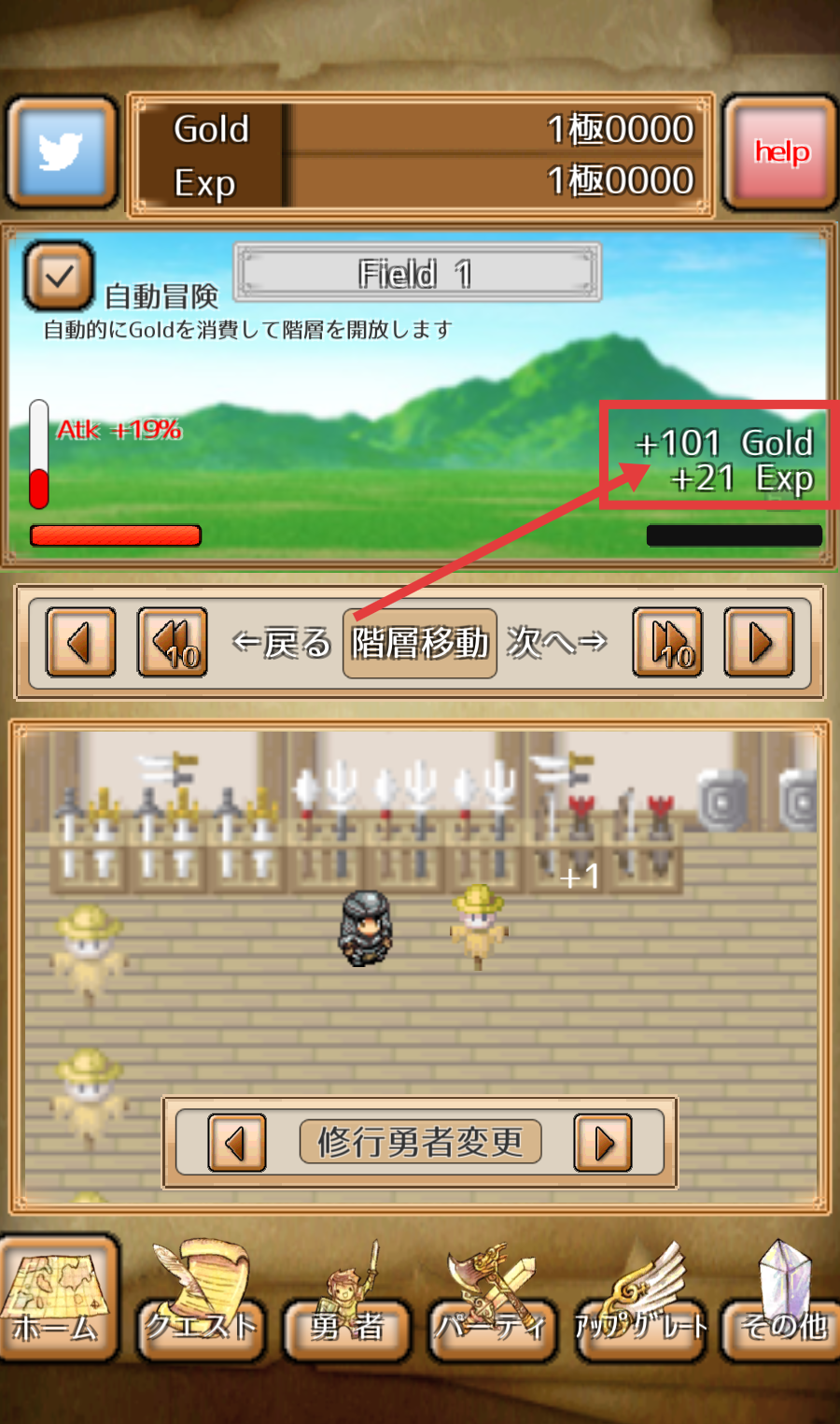4、自动冒险可获得【+101-Gold】【+21-Exp】,利用【階層移動】功能可前往新区域,积累资源提升角色。