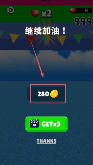 4、最后,点击“继续加油!”按钮尝试继续游戏或点击“GET x3”按钮获取更多金币。