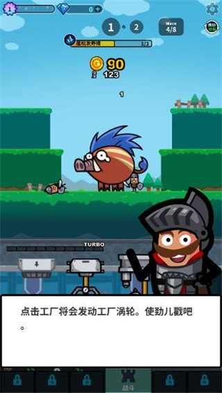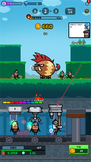 3、在工厂区域升级英雄如战士、弓箭手,提升其战力,以应对更强怪物如野猪怪。