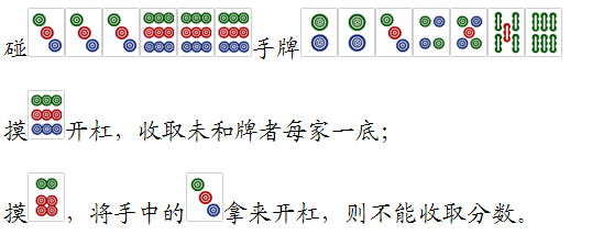 ●摸牌加杠(摸到已碰牌的第四张开杠)收取开杠时未和牌者每家一底,未即时加杠的不收取分数;