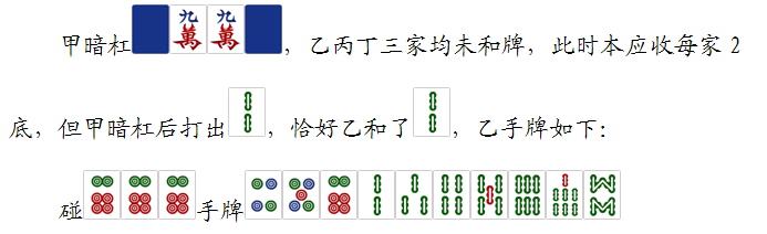 牌例1-2中,乙和牌计杠上炮+根,2番,甲需向乙付4倍底分;在一般规则下,乙丙丁无需支付暗杠分数;而在“呼叫转移”规则下,丙丁仍需支付暗杠分数,只是将支付对象换成了和牌的乙,即甲付放铳杠上炮+根的4倍底分,被暗杠的丙丁各付2倍,乙一共收8倍底分。