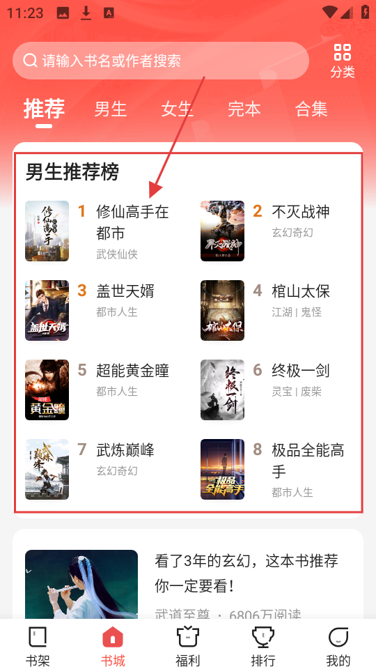 1、打开APP的书城页面,在男生推荐榜中选择目标小说,比如【修仙高手在都市】,点击进入小说详情页啦。
