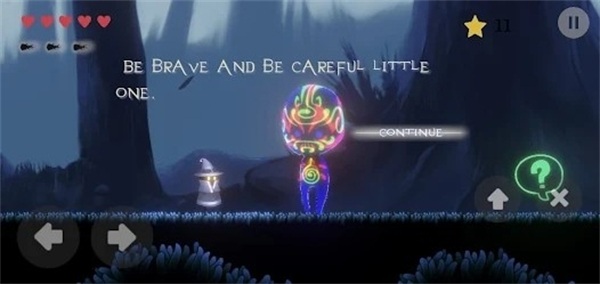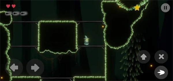 1、操控角色在幽暗森林中移动,靠近发光的神秘装置,触发互动。