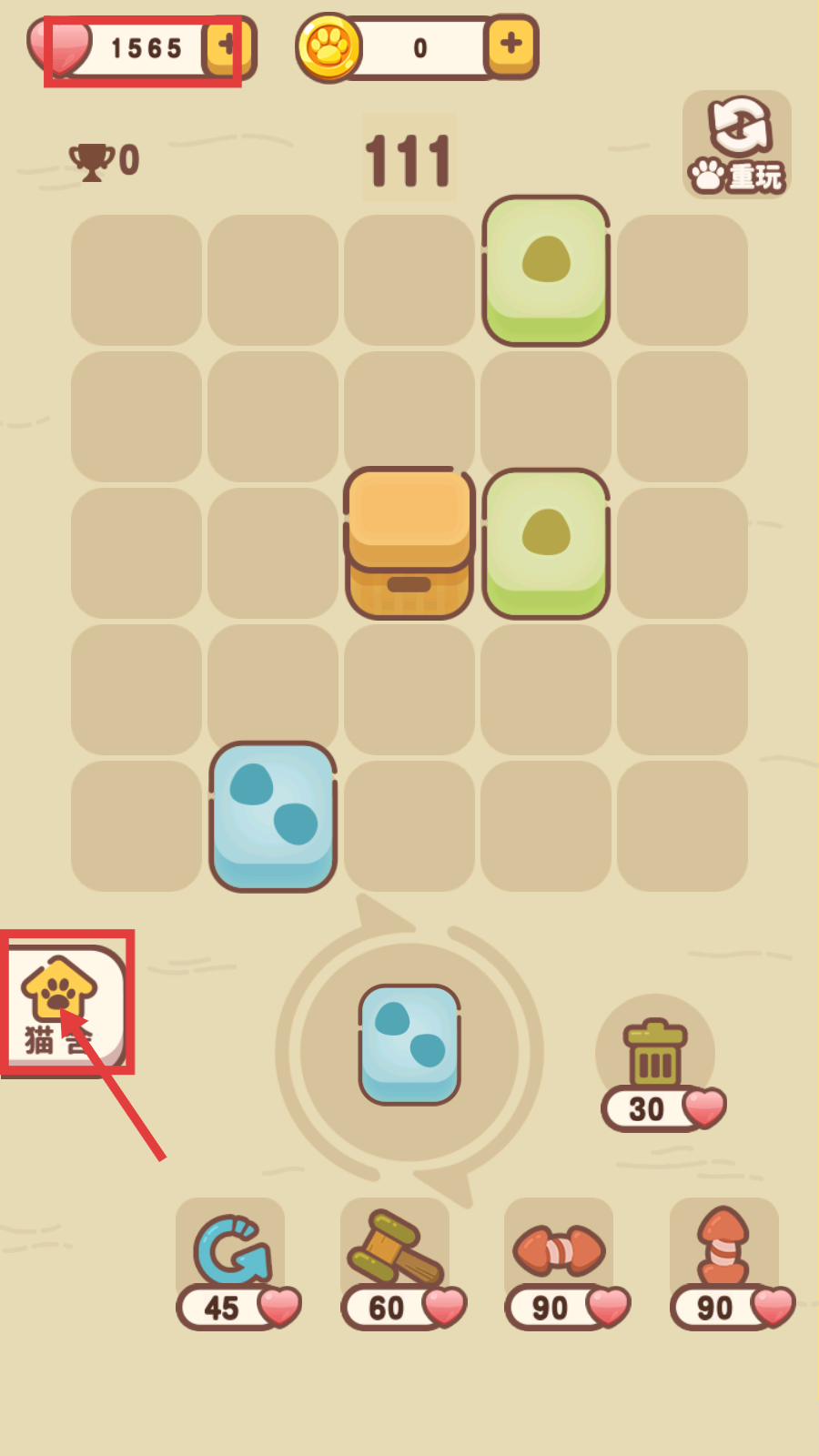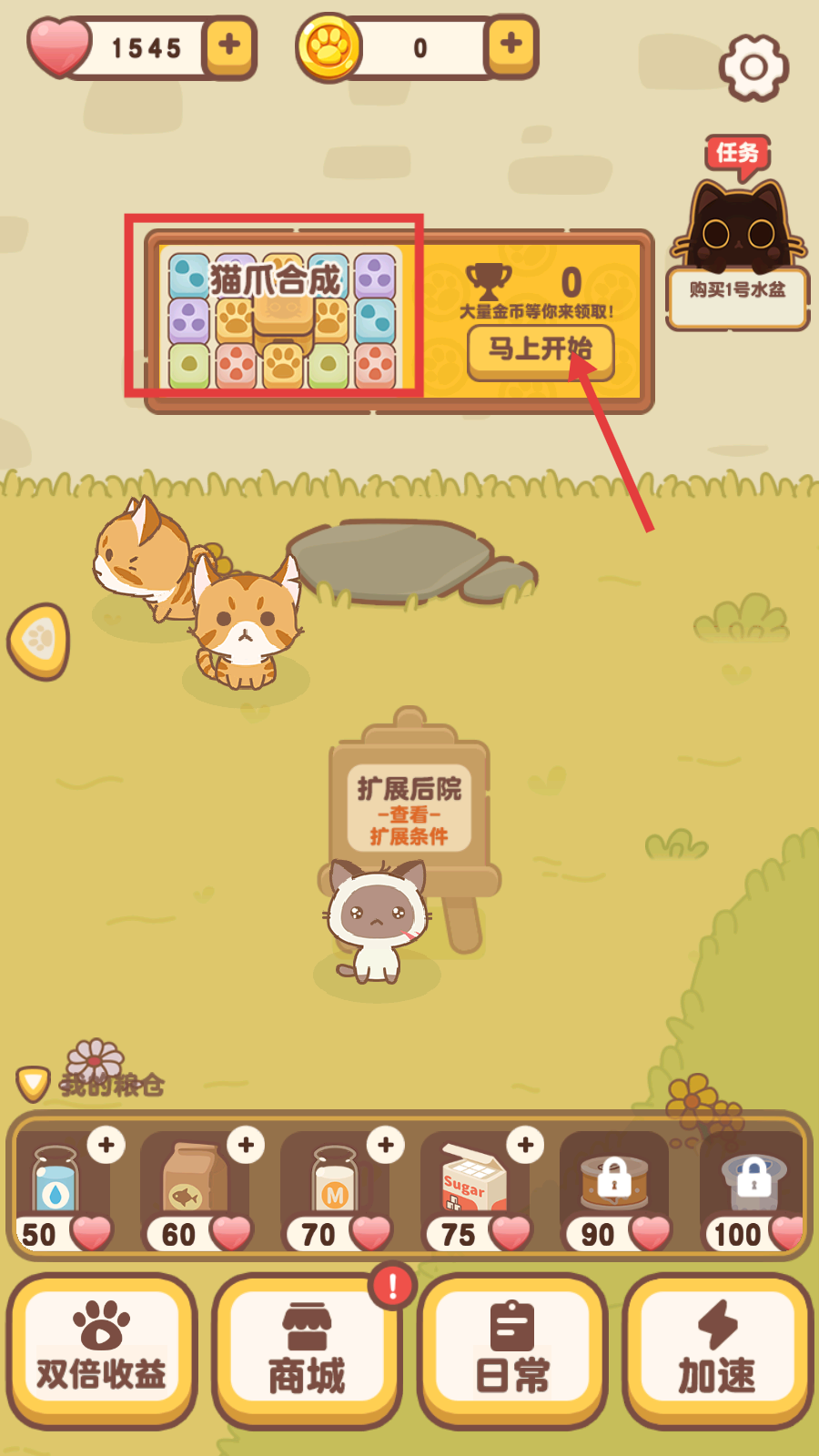 4、合成完成后,爱心值增加(如从1545增至1565),可点击“猫舍”功能,继续推进游戏进程。