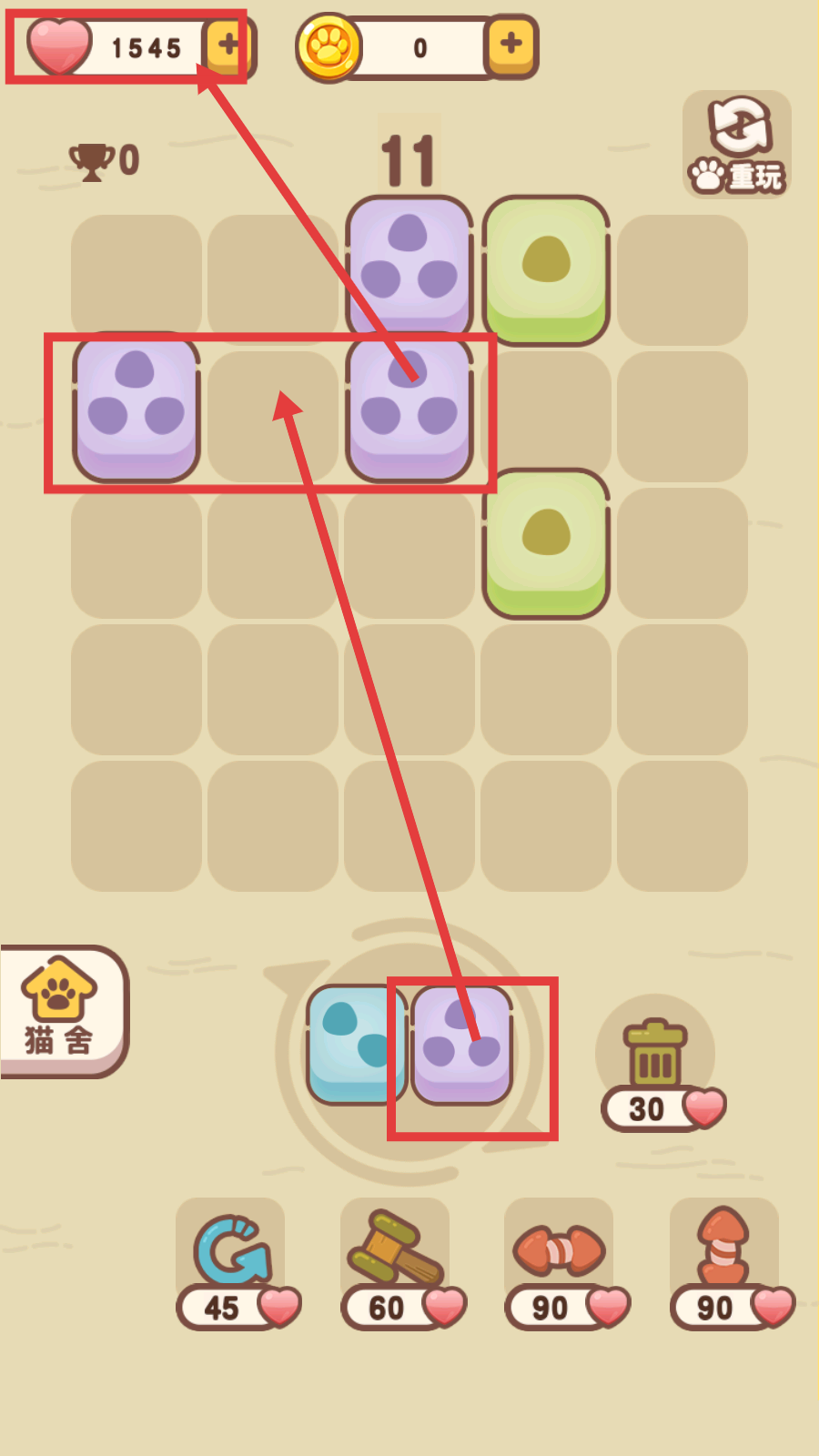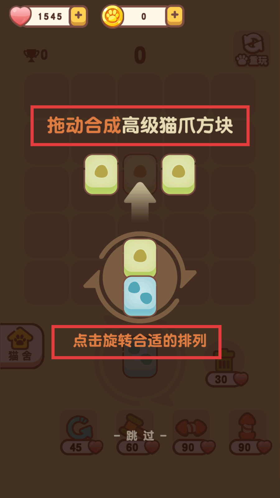 2、拖动相同猫爪方块合成高级方块,点击旋转调整方块排列,以实现高效合成。