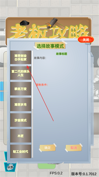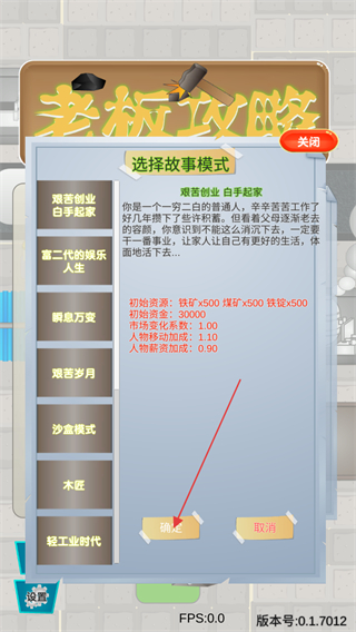 1、选择故事模式,如艰苦创业白手起家,了解背景故事和初始资源,点击确定开始游戏。