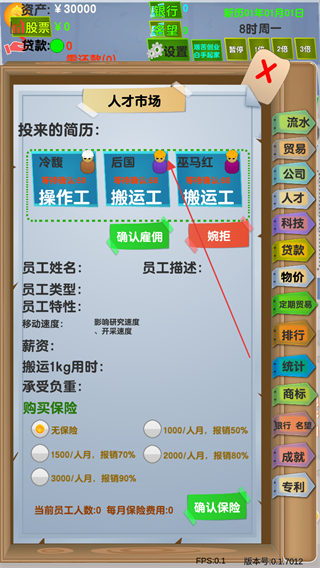 2、进入人才市场,查看投来的简历,选择合适的员工如搬运工,点击确认雇佣,同时可选择购买保险。