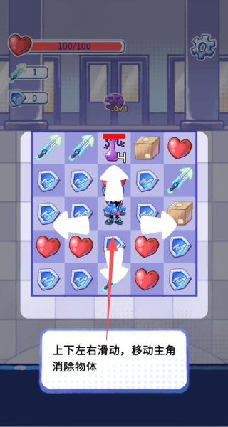 1.通过上下左右滑动屏幕控制主角在格子中移动,移动过程中会自动消除路径上的道具,需提前规划好行进方向。