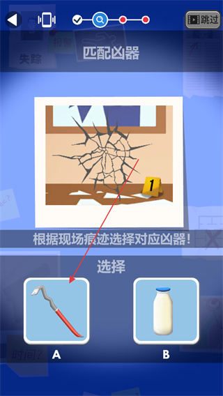 2、匹配凶器,根据现场痕迹选择对应凶器,如根据窗户破损形态选择工具A。