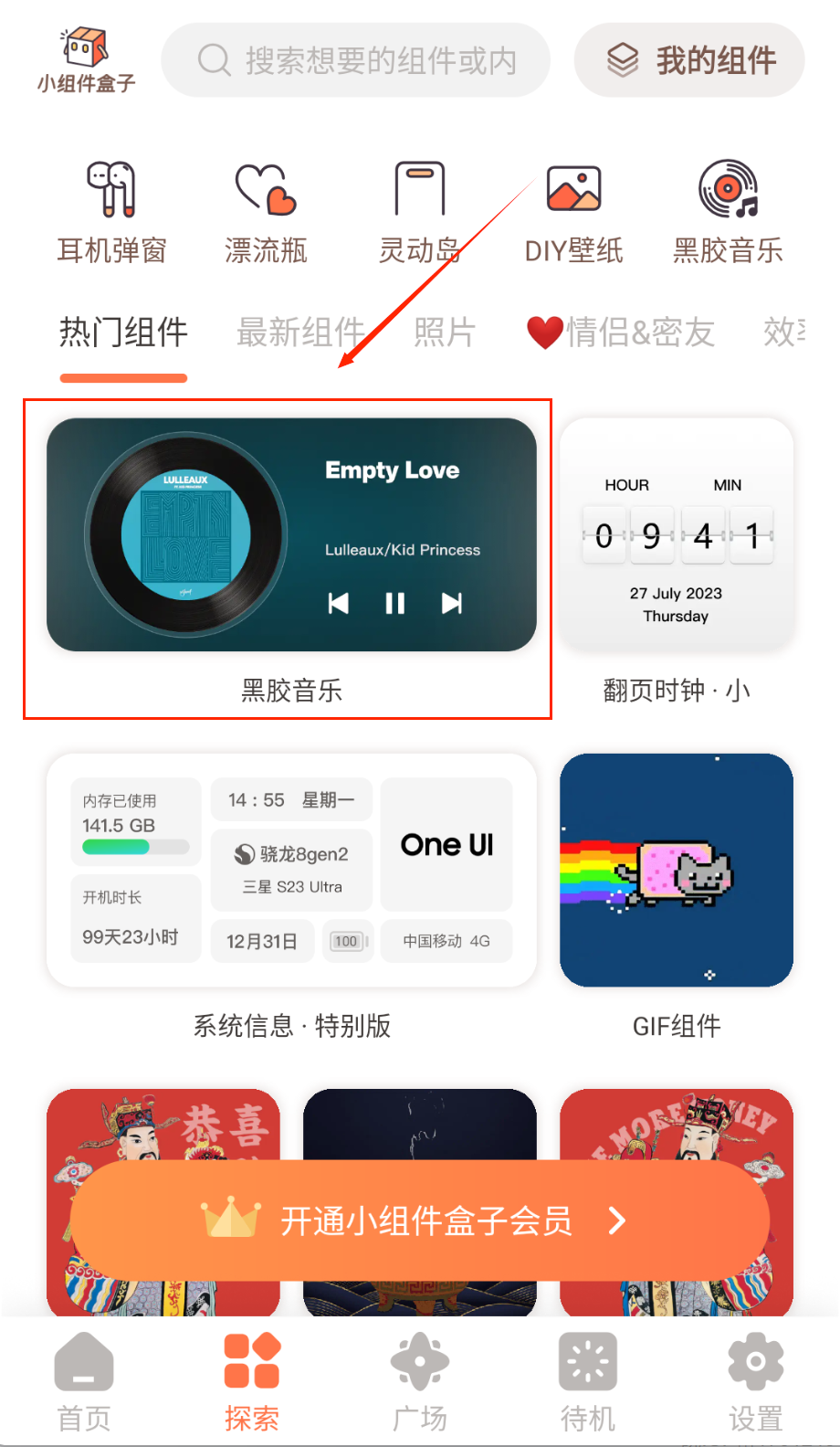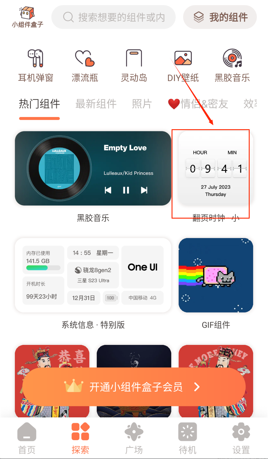 4、小组件盒子里的黑胶音乐和翻页时钟既实用又美观,可以创建多个页面搭配不同场景使用。