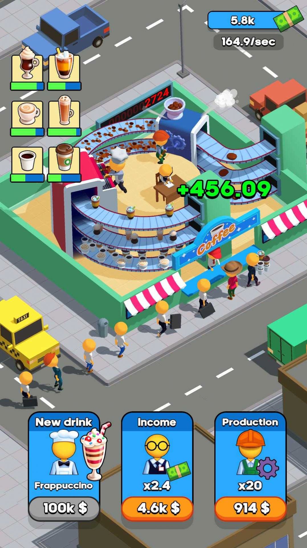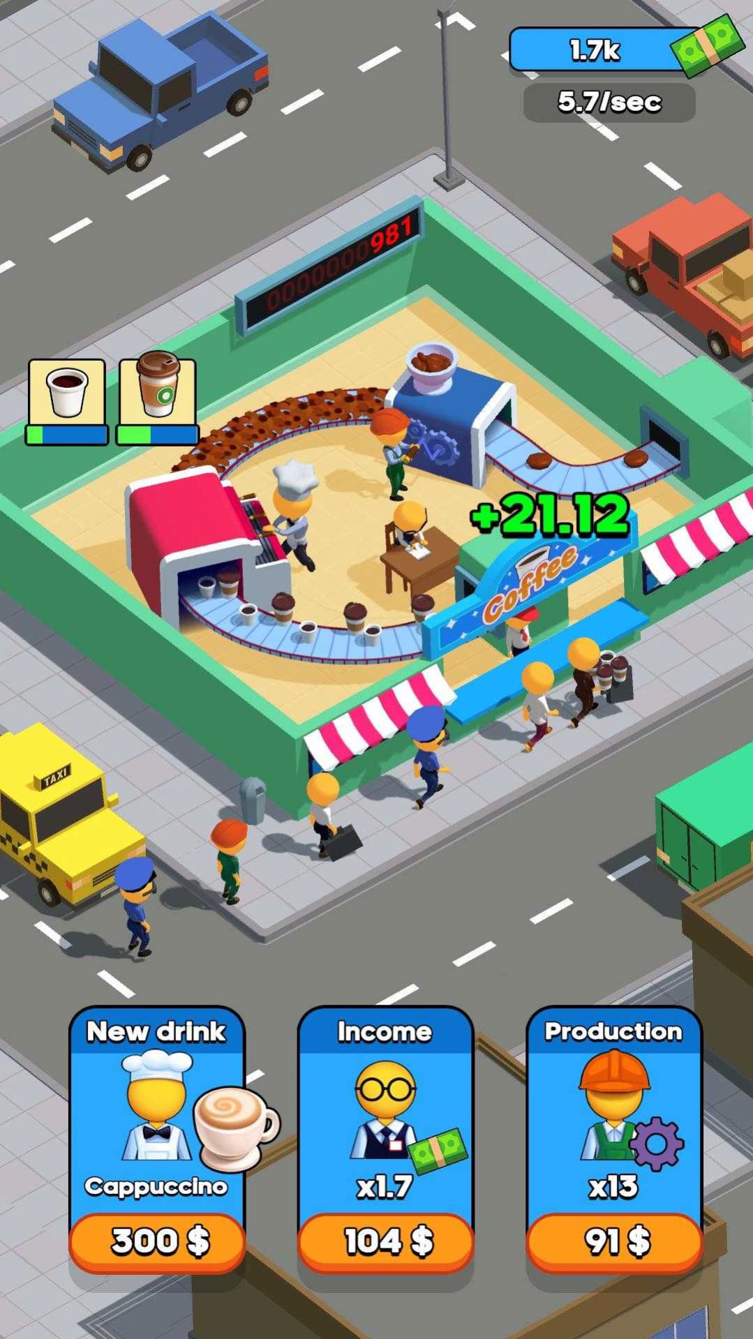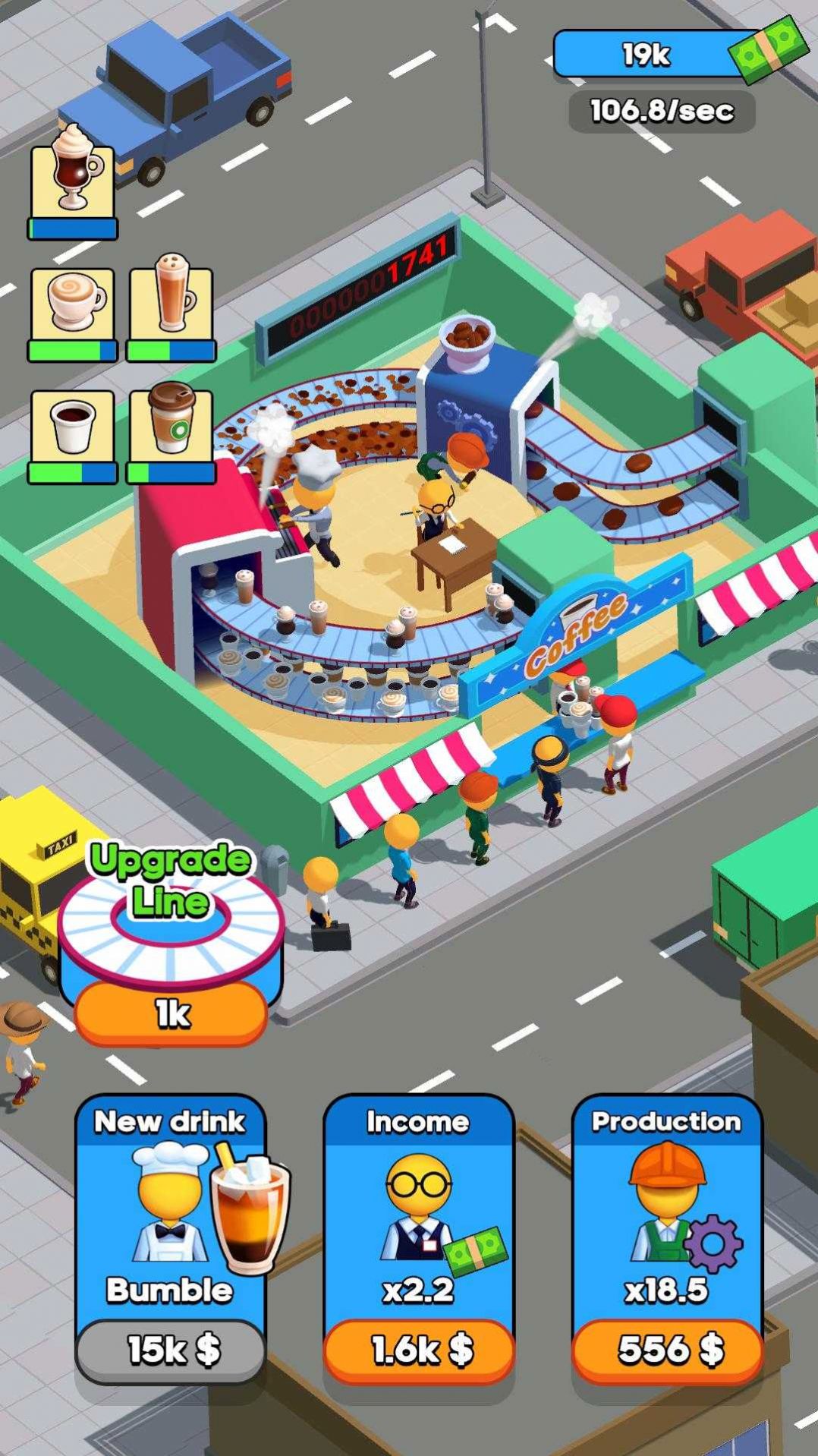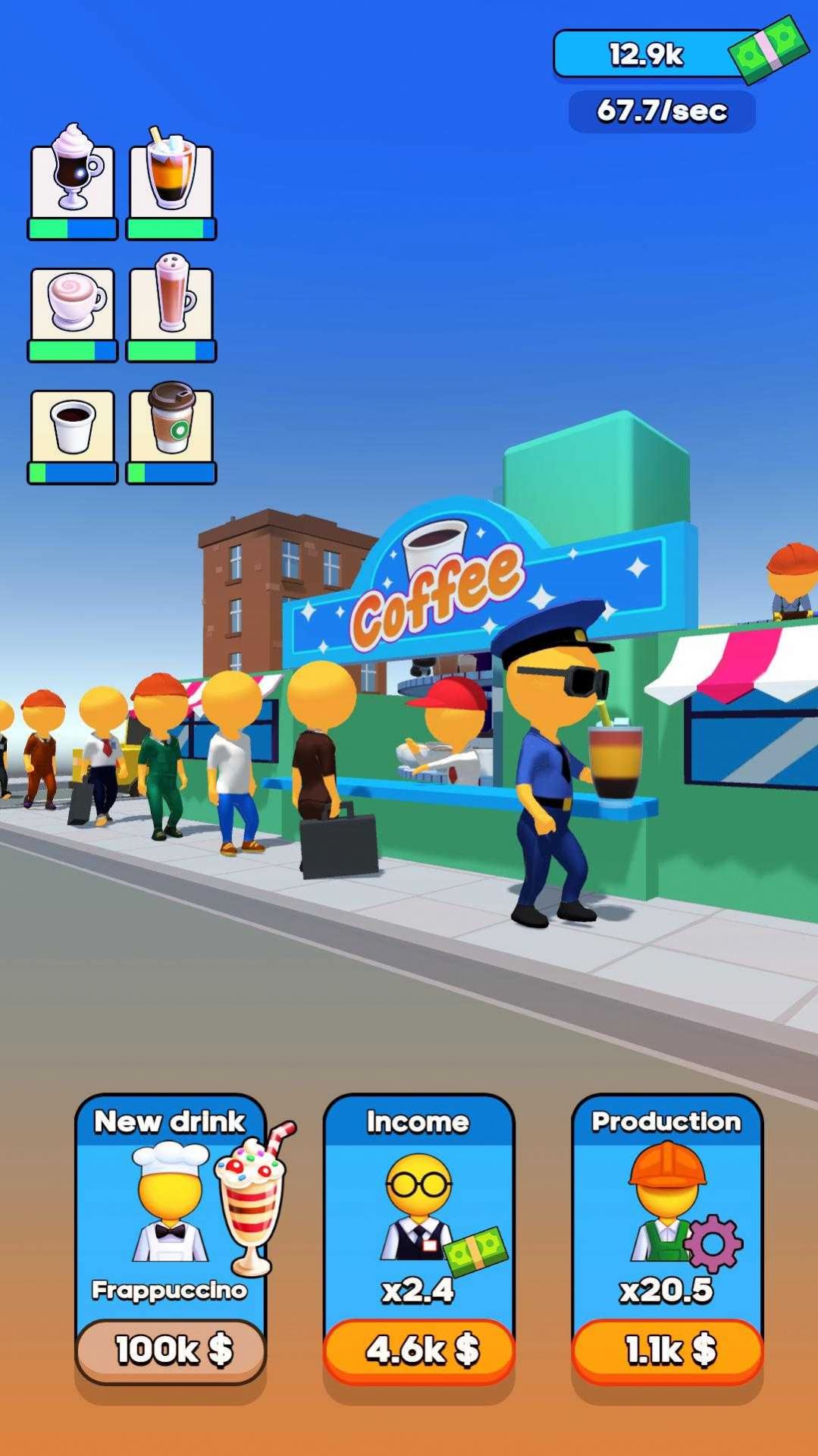 2、在咖啡闲置帝国里面不断地赚取更多收入,逐步发展小店,建立起自己的咖啡帝国。
