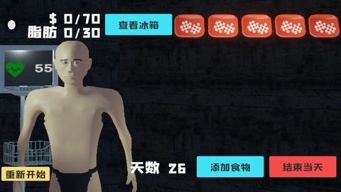 拿上图举例子,有5个托盘,当我们点击5次”添加食物“后,抽到的食物就会自动给角色吃;如果我们只喂4次,那么就需要手动点击"结束当天”,然后食物才会让角色吃掉。