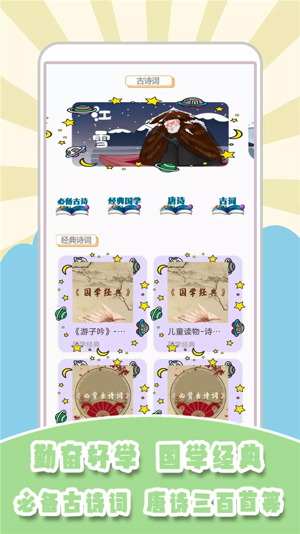 《儿歌星星》是一款非常不错的早教软件,这款软件里是会有非常多的儿歌,用户都是可以在里面听的,而且这是育儿的好方法用户是可以放心的。软件里还会有很多的古诗词用户都可以来学习,是能够给你非常好的体验,里面的儿歌用户都可以自己选择,快来下载使用吧。