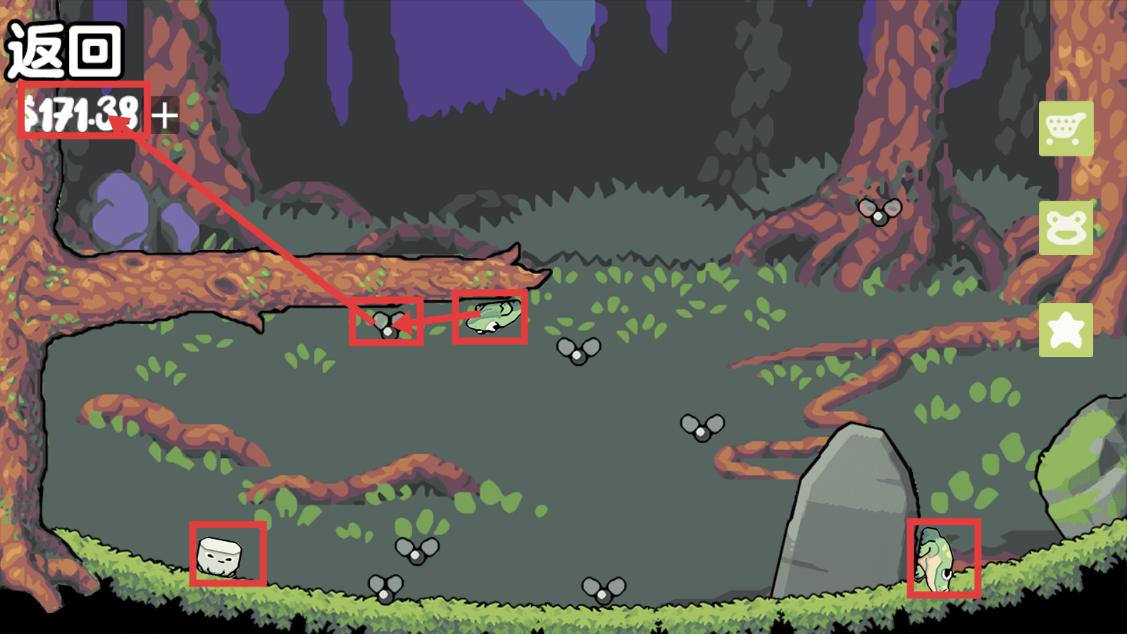3、在森林场景中收集飞虫,积累金钱至【$171.38】,同时观察不同青蛙分布,为养殖做准备。
