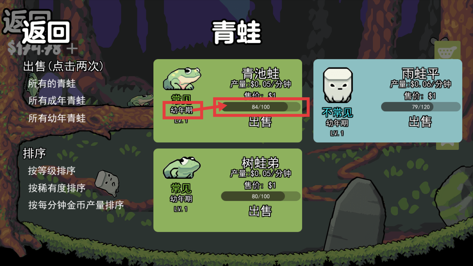 1、在青蛙列表中,将【横竖毒蛙】【角蛙】【雨蛙平】等售价$28的青蛙出售,获取高额收益。