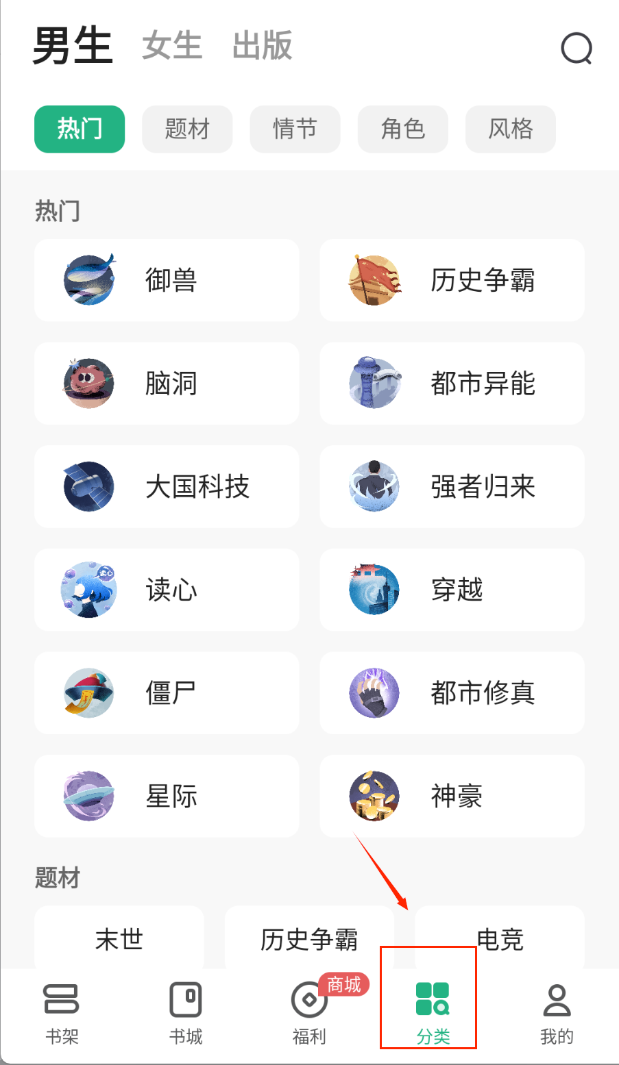 2、探索书籍宝库请进入“分类”板块,根据性别偏好选择“男生”或“女生”频道,再从“热门”题材里挑选脑洞、大国科技、强者归来等感兴趣内容。