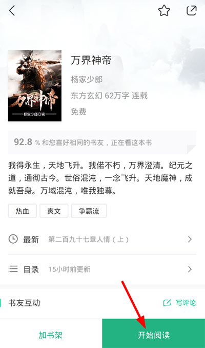 1、在书城页面,能看到各类推荐榜单,找到心仪小说,点击它就能进入阅读页面啦。